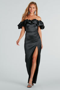 Elodie Formal Ruffled Off-The-Shoulder Satin Mermaid Dress Elodie Formal Ruffled Off-The-Shoulder Satin Mermaid DressSpecial Occasion Embrace major chic energy in the Elodie formal ruffled satin mermaid dress, a stunning choice for a black-tie gala. She features an off-the-shoulder neckline with a dramatic ruffled design and short sleeve cuffs, a fitted bodice with a high waist seam, a floor-length hem with a thigh-high front slit, and a curve-hugging mermaid silhouette. The silky satin woven fabric will showcase a gorgeous sheen. Style this formal long dress with rhinestone chandelier earrings and stiletto heels. Fit & Features - Ruffled off-the-shoulder neckline, ruffled short-sleeve cuffs