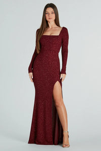 Collen Formal Glitter Mesh Mermaid Long Dress Collen Formal Glitter Mesh Mermaid Long DressSpecial Occasion Sparkling glitter captivates every room on the Collen formal glitter long dress perfect for black tie galas or weddings! She features sheer fitted long sleeves and a square neckline to offer subtle allure, while the twist wrap waist design and mermaid silhouette accentuate your curves. The high front slit and floor-length hem add a touch of drama to this truly enchanting formal dress crafted on airy glitter mesh fabric with a stretchy knit lining. Complete the look with earrings and a clutch! Fit & Features - Sheer fitted long sleeves, square neckline