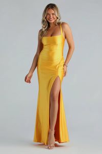 Mara Formal High Slit Mermaid Dress Mara Formal High Slit Mermaid DressSpecial Occasion Simply chic with stunning details, the Mara formal high-slit mermaid dress is perfect for a stylish wedding guest look! She features a sleeveless padded cowl neckline, adjustable spaghetti straps for a customized fit, ruching at the waist, dual vertical seams that run down the dress for a figure-flattering look, a floor-length hem with a thigh-high front slit for a sultry flair, and a mermaid silhouette. Accessorize this formal long dress with a sparkly luxe gemstone necklace and earrings set. Fit & Features - Sleeveless padded cowl neckline