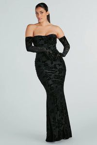 Amai Formal Velvet Strapless Dress With Gloves Amai Formal Velvet Strapless Dress With GlovesSpecial Occasion Exude luxury in the Amai formal dress with gloves! She boasts a strapless neckline, flexible boning inserts, and a flattering mermaid silhouette. This floor-length dress is made with a floral velvet burnout pattern and full knit stretchy lining. Complimented with matching gloves, you'll look sophisticated and undeniably chic. Finish the look with fringe earrings for a black tie party! Fit & Features - Strapless neckline