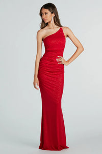 Aileen Formal One-Shoulder Glitter Mermaid Dress Aileen Formal One-Shoulder Glitter Mermaid DressSpecial Occasion Bring the glitzy allure with the gorgeous glitter detailing of the Aileen formal mermaid dress! She features a sleeveless asymmetric one-shoulder neckline with a built-in padded bust, dual spaghetti straps that lead to a strappy back design, ruched detailing at the waist, a dramatic floor-sweeping hem with a figure-flaunting mermaid silhouette, and a glamorous glitter swirl pattern on the knit fabric. Complete your red-carpet-worthy look with rhinestone fringe earrings for that luxe sparkle. Fit & Features - Sleeveless asymmetric one-shoulder neckline, padded bust