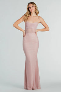 Liv Formal Glitter Corset Mermaid Long Dress Liv Formal Glitter Corset Mermaid Long DressSpecial Occasion Captivate every audience in the Liv formal glitter long dress with your shimmer! She features a sweetheart neckline with a cowl draping, spaghetti straps, a chic sheer corset-trim bodice, and a curve-hugging mermaid silhouette with a graceful floor-length hem. The formal maxi dress is composed of a sparkly glitter mesh fabric with a stretchy knit lining. Finish the look with rhinestone earrings for a fancy birthday soiree or party! Fit & Features - Sleeveless sweetheart neckline, cowl draping