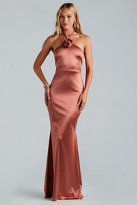 Delphine Formal Satin Rosette Mermaid Dress Delphine Formal Satin Rosette Mermaid DressSpecial Occasion Crafted from a silky chic satin fabric, the Delphine formal dress is everything you're looking for in a party-ready look! She features a sleeveless halter neckline with a rosette flower applique and tie-neck closure, and a curve-flattering mermaid silhouette that gracefully leads to her floor-length hem. The formal dress is composed of silky and smooth satin fabric with a luxe sheen and minimal stretch. Complete the look with rhinestone hoop earrings for bridesmaids or a black tie event. Fit & Features - Sleeveless halter neckline