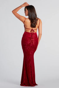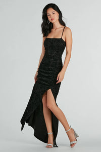 Eve Formal Velvet Scroll Mermaid Long Dress Eve Formal Velvet Scroll Mermaid Long DressSpecial Occasion Your enchanted evening begins with the Eve formal long dress! She features a flattering square neckline, spaghetti straps, and a padded bust for support. Her front ruched seam and mermaid silhouette flaunt your figure while the high front slit allows for movement along the chic floor-length hem. The formal dress is designed with a flocked velvet scroll pattern on smooth knit fabric with minimal stretch. Complete the look with a sparkly clutch for a wedding or formal soiree! Fit & Features - Sleeveless square neckline, spaghetti straps