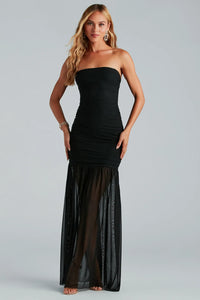 Shaliee Formal Mesh Strapless Mermaid Dress Shaliee Formal Mesh Strapless Mermaid DressSpecial Occasion If you love to make a dramatic entrance, the Shailee formal mesh dress can make that happen! She features a strapless neckline, side ruching to accentuate your figure, a flattering mermaid silhouette, and a sheer floor-length hem. The formal dress is designed from an airy mesh fabric with a short sewn-in knit lining. Complete the look in earrings and stiletto heels for a gala dinner or black tie party! Fit & Features - Strapless neckline