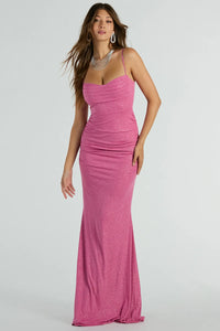 Ayanna Formal Glitter Ruched Mermaid Long Dress Ayanna Formal Glitter Ruched Mermaid Long DressSpecial Occasion Let your curves shine on the Ayanna formal glitter long dress perfect for black tie soirees! She features a stunning cowl neckline adorned with spaghetti straps, side ruched seams that accentuate your figure, a mermaid silhouette, and a graceful floor-length hem. Crafted from a glitter knit fabric that brings endless sparkle and has a stretchy lining. Finish the look with rhinestone bracelets for extra elegance! Fit & Features - Sleeveless cowl neckline, spaghetti straps