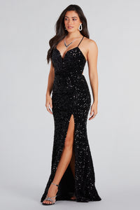 Giselle Formal Sequin Velvet Lace-Up Dress Giselle Formal Sequin Velvet Lace-Up DressSpecial Occasion Turn heads in this exquisite Giselle formal sequin velvet long dress while walking the red carpet or attending a black tie soiree! Crafted from luxurious sequin velvet knit fabric, she features a plunge wired V-neckline, padded bust, and spaghetti straps, with a beautiful lace-up back. The elegant mermaid silhouette boasts a high slit and sweeping floor-length hem, making it the perfect choice for any special occasion. Complete the look with a rhinestone collar necklace and heels! Fit & Features - Sleeveless plunge wired V-neckline