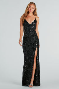 Vivian Cowl Neck Mermaid Mesh Formal Dress Vivian Cowl Neck Mermaid Mesh Formal DressSpecial Occasion Indulge in the beauty and grace of the Vivian cowl neck long formal dress perfect for bridesmaids, wedding guests, or any fancy occasion! Adorned with a delicate lace trim and flocked velvet pattern, this sleeveless gown features an alluring cowl neckline that highlights your bust and adjustable spaghetti straps for a custom fit. The mermaid silhouette and high front slit ensure an elegant and flattering fit, while the floor-length hem adds a touch of sophistication. Style this formal dress with rhinestone fringe earrings, a ring set, and block heels for an unforgettable look! Fit & Features - Flocked velvet pattern, mesh fabric with knit lining