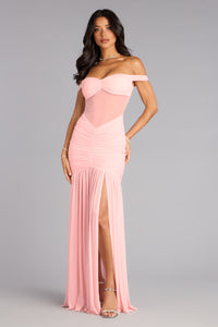 Built for that slow-motion entrance, the Eliza formal dress stuns with sheer mesh paneling and an off-the-shoulder neckline that feels effortlessly alluring. Its ruched high-slit mermaid silhouette hugs and highlights every curve, creating a chic moment from every angle.