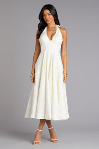 A timeless beauty with modern allure, the Ellen jacquard halter midi formal dress flatters with its plunging neckline and softly flared skirt. The lace-up back detail adds just the right touch of sophistication for dinners, weddings, or any elegant soirée.