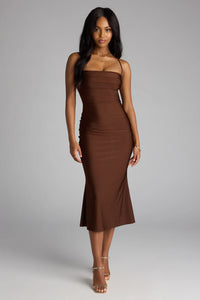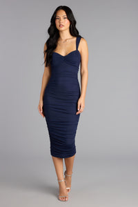 Sleek, sculpted, unstoppable—this midi dress sets the tone for every RSVP on your calendar. The ruched mesh hugs in all the right places, serving body and confidence with zero effort.