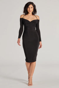 An alluring mesh off-the-shoulder midi dress perfect for date night and cocktail parties. The dress features sheer fitted long sleeves and a waist insert giving an hourglass illusion along the bodycon silhouette. Complete the look with earrings.