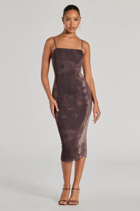 Florals but make them sultry. With a sleek fit, tie-back detail, and velvet rose patterns, this midi dress brings a romantic allure to date nights, parties, and cocktail soirees.