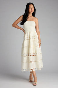It'll be love at first wear in this strapless midi dress, perfect for shower celebrations, brunch, or parties! The intricate eyelet detailing adds a touch of romance while the flattering A-line silhouette accentuates your figure.
