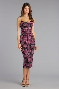 Playful yet chic, this floral mesh midi dress brings charm to any dressy event or occasion! Designed with ruched side seams that enhance your silhouette with a flattering bodycon fit.