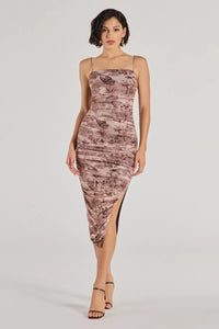 Showcase a stunning look in this mesh midi dress detailed with a nature-inspired scenic print and metallic thread embroidery. It features a sleeveless square neckline, adjustable spaghetti straps, ruched side and back seams to accentuate your curves, and a midi-length bodycon silhouette accented with a high side slit.