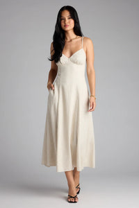 A chic twist on a classic sundress. This head-turning midi dress is designed with an open tie-back with button accents and hidden side pockets that keep your hands warm!