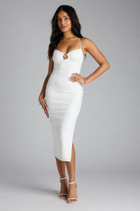 - Midi-length bodycon silhouette, high side slit
