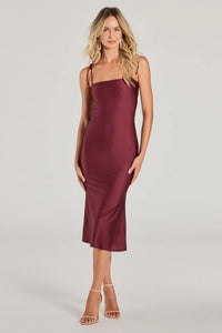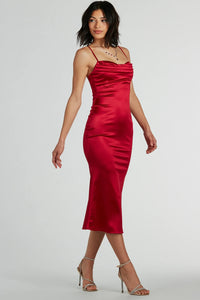 Unleash your boldness and feel luxurious in this satin midi dress perfect for cocktail parties or rehearsal dinners! The cowl neckline and spaghetti straps exude elegance, while the A-line silhouette creates a flattering look along the midi-length hem on silky smooth satin fabric. Complete the look in rhinestone heels and jewelry.