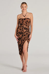 This chic flocked velvet floral midi dress is designed with a sheer mesh fabric with knit lining for coverage. It features a strapless straight-across neckline, a ruched front seam leading to an alluring high-cut slit, and a midi-length slim-fit silhouette. Complete your cocktail party look with strappy stilettos.