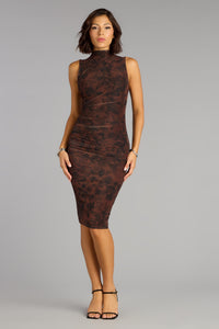 A sleeveless abstract marble print mesh midi dress features a sleek crew neckline, a flattering form-hugging fit, and a flirty side slit. Pair with heels.