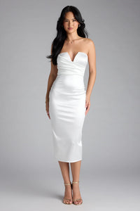 A sophisticated design that stands that's timeless, the Krissy satin formal dress will leave everyone speechless! The strapless tube design with alluring V-cut neckline accentuates the style, while the sleek bodycon midi silhouette hugs your curves in all the right places.