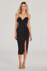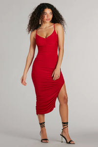 The kind of midi dress that does all the talking for you. A body-hugging fit with a daring slit makes it your go-to for nights that call for chic confidence.