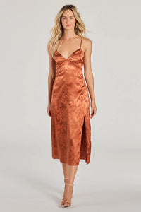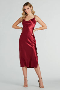 Captivate in this elegant satin slip midi dress perfect for rehearsal dinners or cocktail parties! The midi-length dress features a sleek cowl neckline, adjustable spaghetti straps, a flattering curve-hugging silhouette, and a flirty side slit along the hem. Complete the look in stiletto heels and a clutch!