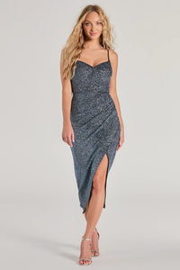 A sparkling glitter midi dress featuring a sweetheart neckline with padded bra cups for support, spaghetti straps, and a side pleated seam that shapes the high front wrap slit along the bodycon silhouette.