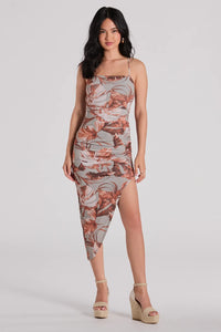 Have the sweetest look in this tropical midi dress for your next vacay escape! With a flattering square neckline, delicate spaghetti straps, and a lace-up back, this bodycon dress will hug your curves down to the high-cut asymmetrical midi-length hem. Complete the look in espadrille wedges.