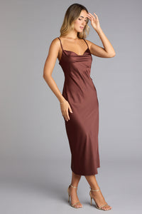 Take the city looking chic for cocktails in this sleeveless midi dress! Featuring a sultry cowl neckline, bungee spaghetti straps, and a form-hugging fit to flatter your curves. Complete the look with earrings, a bracelet, and heels!