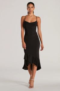 This sleeveless midi dress will be your favorite secret weapon for a chic look at parties or nights out! The spaghetti straps and cowl neckline accentuate your curves, while the bodycon fit flatters your figure. With an asymmetrical tiered ruffle midi-length hem, this dress is sure to make a statement. Complete the look in strappy block heels.