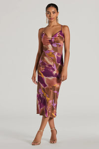 This sleek and chic satin midi dress exudes that classic glamour for dressy parties! It features a sleeveless cowl neckline, spaghetti straps, chic pleating at the waist for a figure-flattering look, a midi-length hem with a faux wrap-front design creating a front slit, and a slim-fit silhouette. The satin-knit fabric offers a moderate stretch. Complete your cocktail party look with rhinestone duster earrings and strappy stiletto heels.