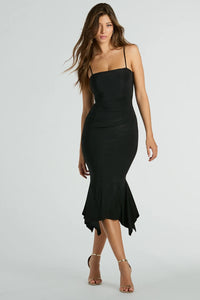 Get swept away by the chicness of this bodycon midi dress perfect for rehearsal dinners or cocktail soirees! With a flattering square neckline, delicate spaghetti straps, and bodycon fit, this dress is perfect for any occasion. The side pleated seam adds an extra touch of elegance, while the ruffled midi-length hem adds a feminine and flirty flair. Complete the look in earrings and stiletto heels.