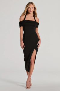 Dial F For Flirty Off-The-Shoulder Halter Midi Dress