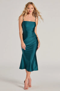 Selene Lace-Up Ruched Glitter Formal Midi Dress