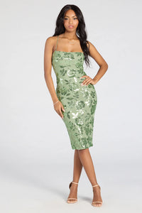 An ethereal floral sequin pattern embellishes this glam midi dress showcasing a lace-up back and bodycon fit perfect for cocktail soirees or date night!