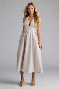 Turn every head in the room with the help of this sleeveless midi dress at the cocktail party! Feel confident and sultry in the plunge cowl halter neckline, open back, and elegant A-line silhouette leading to the midi-length hem for a chic touch. Complete the look with earrings and heels.