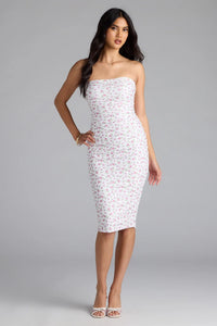 So sweet and sultry in every way, this floral midi dress flaunts a sleek, flattering strapless neckline and bodycon fit perfect for shower celebrations or casual events.