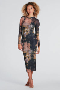 Downtown Chic Abstract Print Midi Dress Downtown Chic Abstract Print Midi DressThis alluring abstract print midi dress is a stylish pick for a dinner date downtown! It features a mock neckline, long fitted sleeves, a midi-length hem, a form-hugging silhouette, and an all-over abstract multi-print pattern. The sheer and stretchy mesh fabric includes a sleeveless full-length knit lining with adjustable spaghetti straps. Pair this trendy midi dress with gold hoops and clear heels. Fit & Features - Mock neckline
