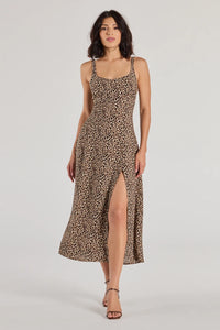 Elevated Leopard Print Woven A-Line Midi Dress Elevated Leopard Print Woven A-Line Midi DressTrendy and elevated, this leopard-printed woven midi dress features a sleeveless square neckline, adjustable spaghetti straps for a customized fit, and a partially smocked back for added stretch. The high front slit adds a bold vibe to the mid-length A-line silhouette. Fit & Features - Leopard-printed woven fabric, no stretch