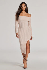 Cozy Luxe Cable Knit Off-The-Shoulder Midi Dress Cozy Luxe Cable Knit Off-The-Shoulder Midi DressShow off a luxe look while still keeping it cozy in this soft cable knit midi dress is designed with an off-the-shoulder fold-over neckline, long fitted sleeves, and a high front slit to accent the midi-length form-hugging silhouette. Style with knee-high boots or strappy heels! Fit & Features - Ribbed cable knit fabric, plenty of stretch