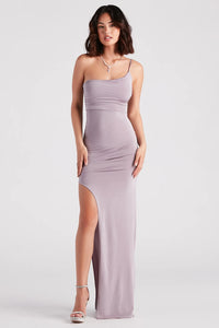 Envoke timeless beauty in the Kiera formal satin dress for a luxurious look at banquets, rehearsal dinners, and dressy cocktail events! She features a sleeveless one-shoulder neckline with dual adjustable spaghetti straps, a padded bust, front ruched seams, and a bodycon silhouette with a flirty slit midi hem. The formal dress is composed of a silky satin-lined fabric with a sheen effect and minimal stretch. Complete the look with sparkly stiletto heels.