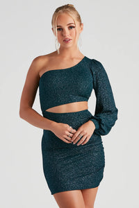 Steal the shine and the spotlight glistening in this glitter short dress at every party this season! The mini dress features a one-shoulder neckline with a long balloon sleeve, a cutout waist, side ruched seam to accentuate your curves along the bodycon silhouette. Complete the look in strappy block heels.