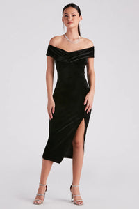 Every girl needs a chic and stunning velvet midi dress for weddings, banquets, or soirees! The Mary velvet formal dress features an off-the-shoulder, foldover asymmetrical neckline, a fitted bodice with a wrap-front design, short sleeves, and a curve-hugging, midi-length silhouette with a stylish side slit. The luxe velvet fabric will elevate your look all the more! Complete your outfit with a rhinestone jewelry set.