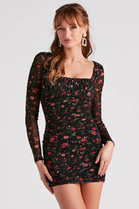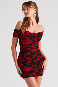 You in this floral mesh dress to meet them at midnight! Mesmerize in this off-the-shoulder mini dress featuring a sweetheart neck, short-sleeve cuffs, a padded bust, and side ruched seams that accentuate your curves along the bodycon silhouette. Complete the look in strappy lace-up heels.