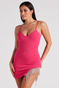 Dazzle them all with your stunning beauty in this curve-hugging mini dress showcasing the prettiest sparkle! The mini dress features a sleeveless V-neckline, adjustable spaghetti straps for a customized fit, a short bodycon silhouette, and a chic side slit with cascading rhinestone fringe. The crepe fabric includes a full knit lining. Style this party dress with rhinestone hoops.