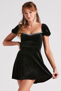 This chic velvet skater dress was made for your next glamorous party! It features a sweetheart neckline embellished with a sparkling rhinestone trim, adorable short puff sleeves, a high waist seam, and a short skater skirt with a fit and flare silhouette. The smooth velvet fabric brings luxe vibes to your look. Style with rhinestone duster earrings.