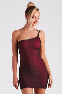 Hit the club with a hint of glamour! This crepe mini dress showcases the perfect amount of radiance in a sleeveless one-shoulder neckline with rhinestone trim, a spaghetti strap, a bodycon silhouette, and a flirty hem slit. Style with earrings and a bracelet for added shine!