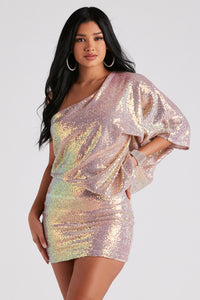 Kimberly is here for your dramatic entrance into every holiday party! She glistens and gleams in a shimmering array of sequins that dance along her one-shoulder neckline, flowy kimono-style sleeve leading to her draped bodice, and short bodycon silhouette. The formal dress is composed of a sequin-knit fabric with a sewn-in knit lining and minimal stretch. Style your hair with a glamorous comb or barrette to create a flawless side part!